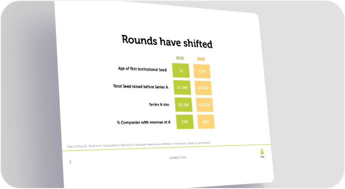 Rounds have shifted 2010 2019 Age of first institutional Seed 1y 2.5y Total Seed raised before Series A $1.3M $5.6M Series A size $5.1M $15.7M % Companies with revenue at A 15% 82% Source:Wing VC. Techcrunch. A quick look at how Series A and seed rounds have ballooned in recent years, fueled by top investors 7 LAUNCH 2019 Pear