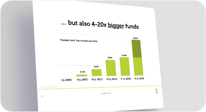 … but also 4-20x bigger funds $200M “Example Fund” size increase over Hme $100M $85M $35M $7.4M I (y. 2004) II (y. 2007) III (y. 2011) IV (y. 2013) V (y. 2016) VI (y. 2019) Source: SEC Form -D filings 6 LAUNCH 2019 Pear