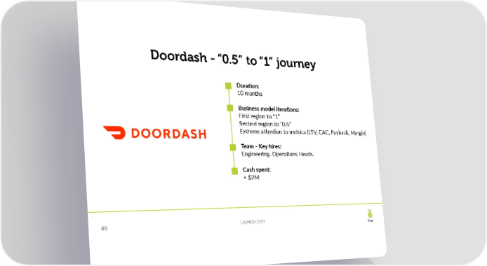 Doordash - “0.5” to “1” journey Duration: 10 months Business model iterations: First region to “1” Second region to “0.5” Extreme attention to metrics (LTV, CAC, Payback, Margin) Team - Key hires: Engineering. Operations Heads. Cash spent: < $2M 46 LAUNCH 2019 Pear