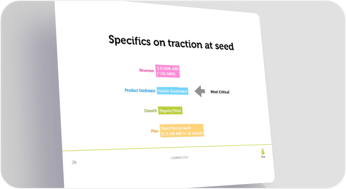 Seed Financing Landscape Page 25 Page 27Specifics on traction at seed Revenue $ 0-200k ARR (~10k MRR) Product Stickiness Fanatic Customers Most Critical Growth Organic/Viral Plan Clear Plan to reach $1.5-2M ARR in 18 months 26 LAUNCH 2019 Pear